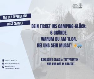 Samstag, 11.04.2026 | 10:00 – 17:00 Uhr📍 Kampstraße 6, 31180 Giesen / Hasede – Besuchen Sie uns am Tag der offenen Tür! Entdecke das Campen