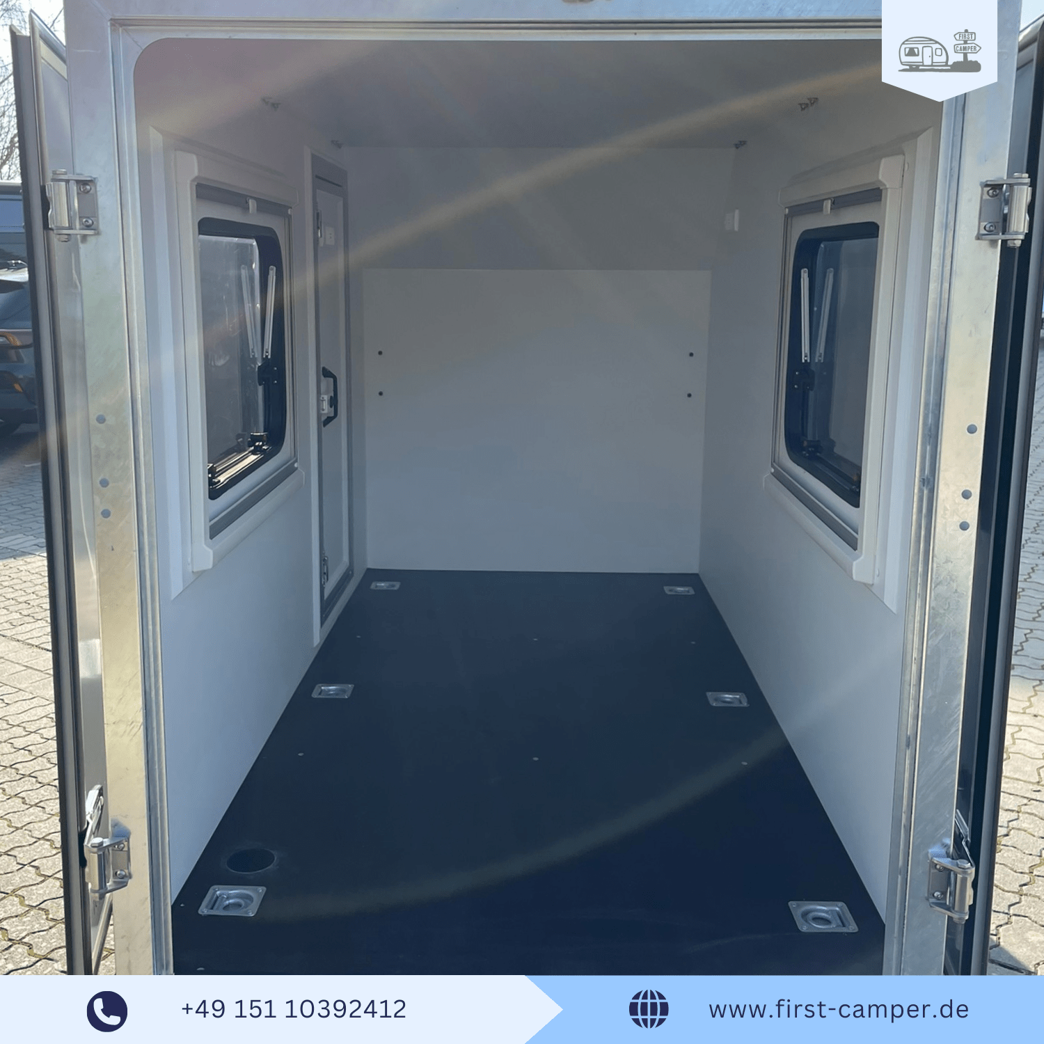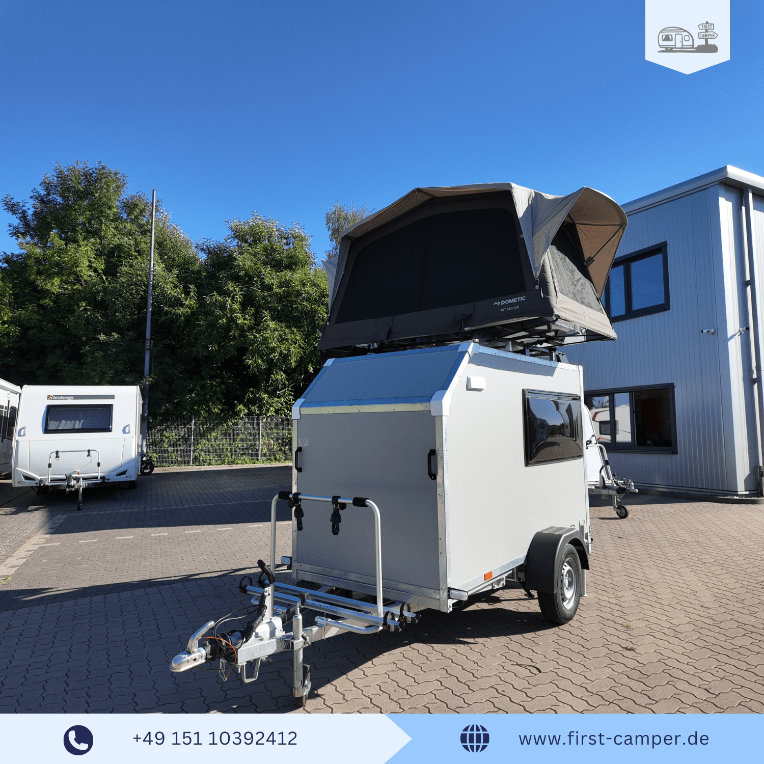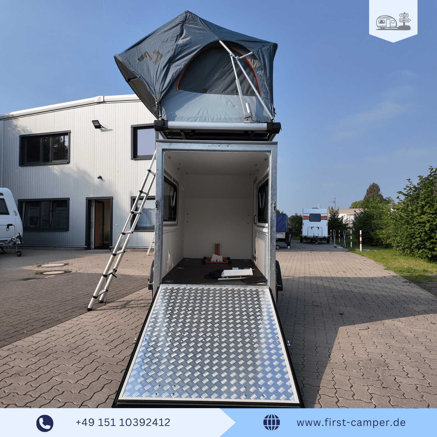 Unser Adventure, der speziell für den Transport von Motorrädern, Fahrrädern oder anderem Sportzubehör konzipiert ist, bietet eine ideale Kombination aus Funktionalität und Komfort. Mit einem robusten und geräumigen Innenraum ausgestattet, bietet er genügend Platz für den sicheren Transport von Sportausrüstung. Dank spezieller Befestigungspunkte und Zurrleisten bleibt das Zubehör während der Fahrt stabil und geschützt. Auf dem Dach des Campers lässt sich ein Dachzelt installieren, wodurch zusätzliche Schlafmöglichkeiten geschaffen werden, ideal für Outdoor-Abenteuer und spontane Übernachtungen. Dieser kompakte Wohnanhänger vereint Mobilität und Vielseitigkeit und ist somit perfekt für sportlich Aktive, die Komfort und Flexibilität schätzen.