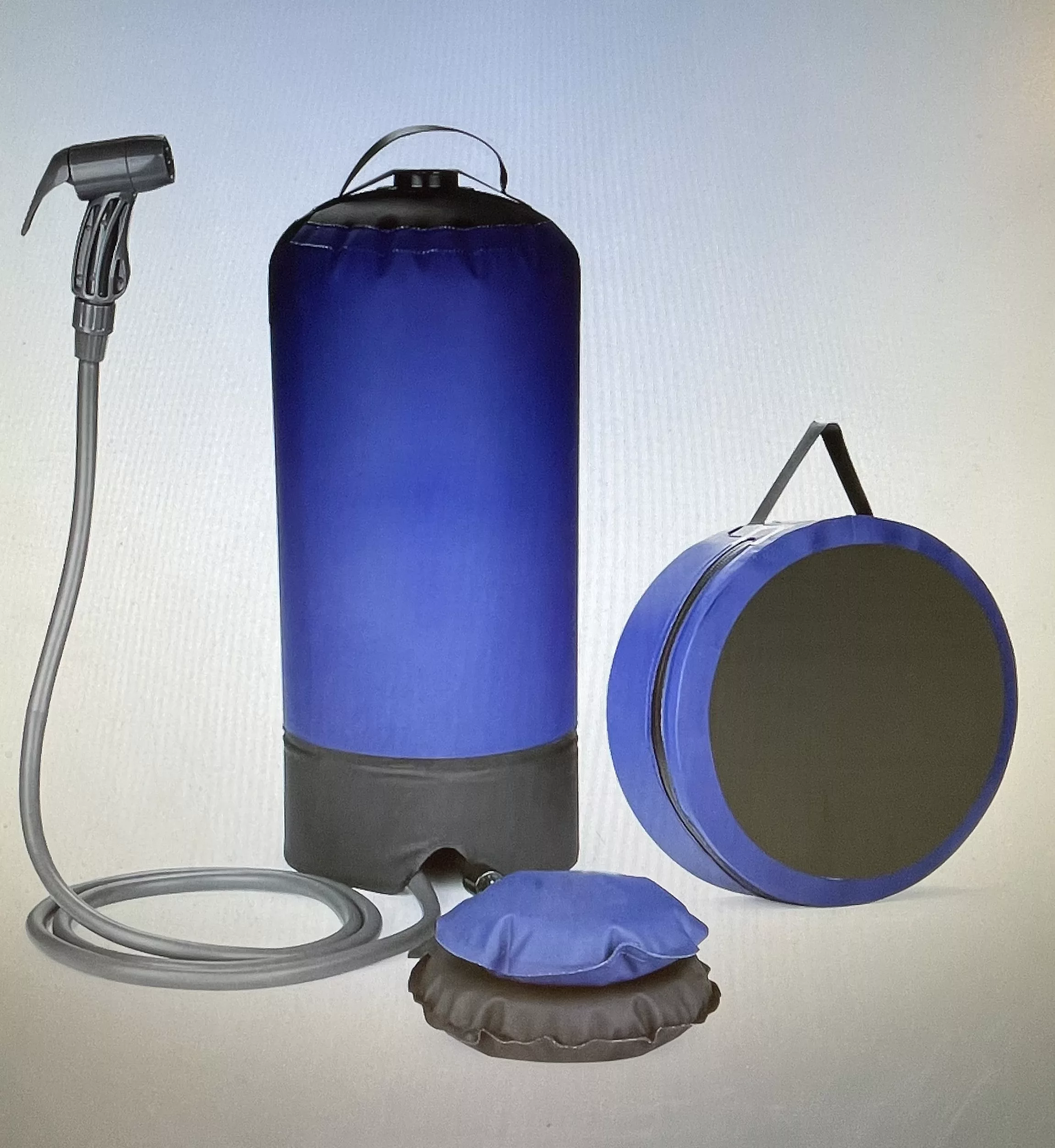 Tragbares Duschset mit Fußpumpe. Die Länge des Brauseschlauchs beträgt 1,95 m.